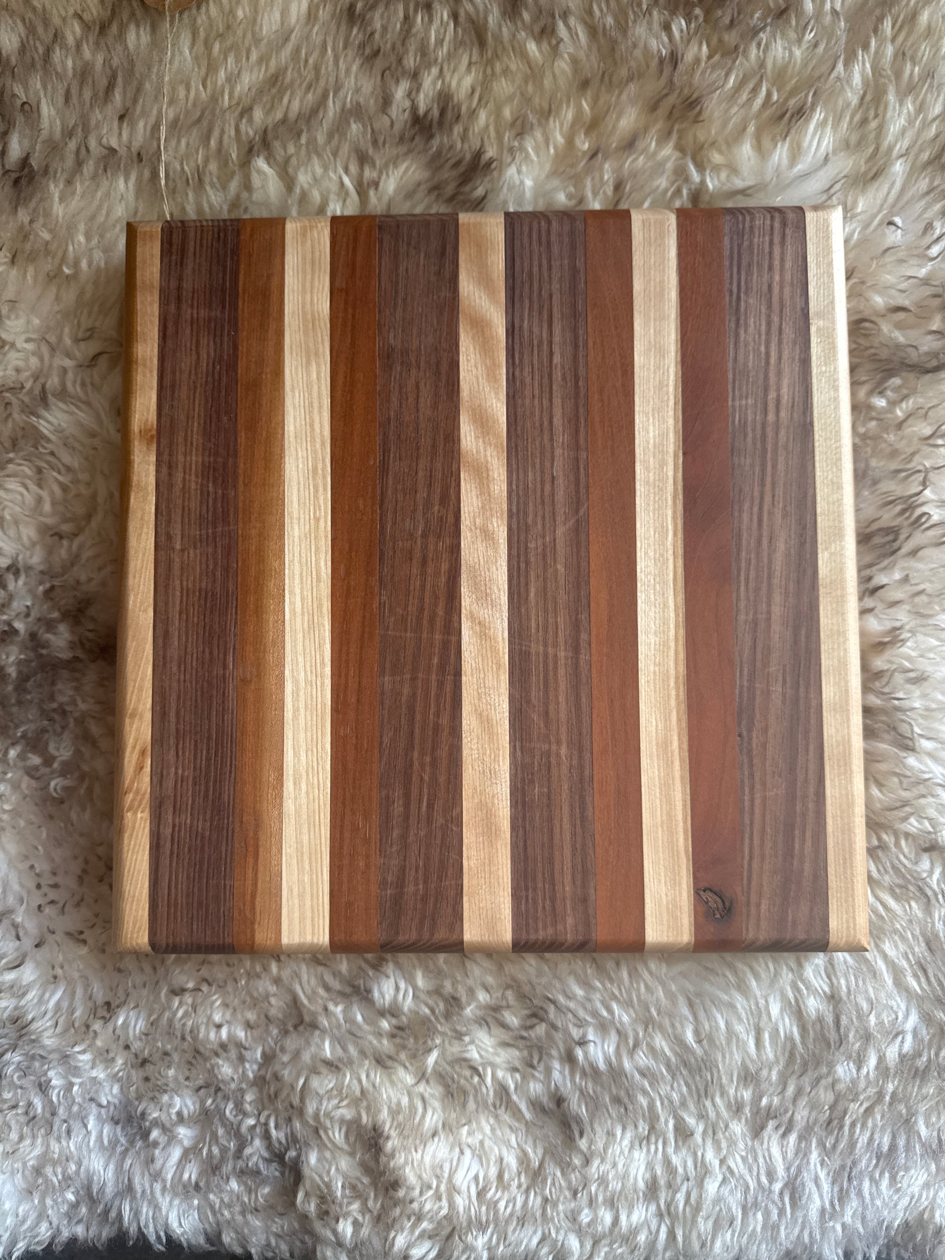 Expertly crafted with precision and care, this cutting board from Bear Scratch Sawmill boasts stunning cherry, maple, and black walnut wood patterns. The addition of rubber feet ensures stability while displaying its one-of-a-kind design. A must-have for any kitchen, this board brings exceptional artistry and functionality to your cooking experience that's built to last.