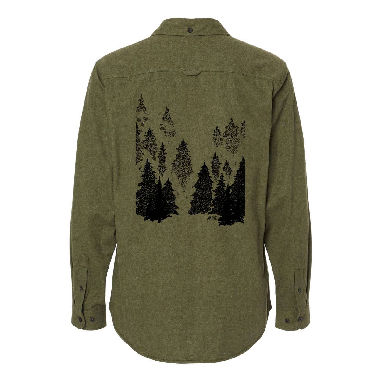 Head into the evergreen trees in our newest design. "Into the Evergreen" features a foggy morning forest scene with crosshatching details which screams, Take me on an Adventure! Dark pine green with black print on back and small Akinz tag on front. Black accent buttons. Original design by Akinz founder/owner, Suzanne Akin.