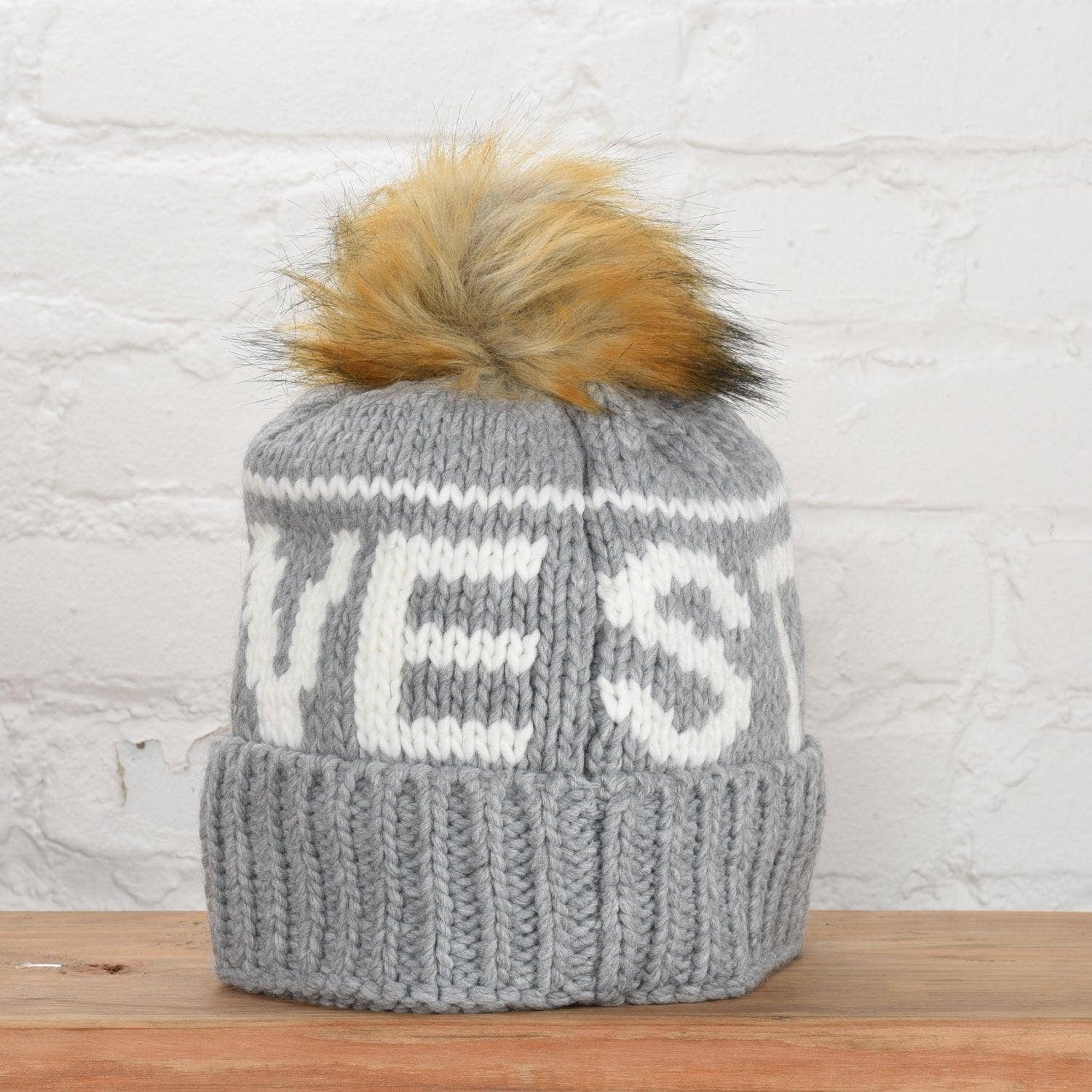 Stay warm and stylish with the Midwest Beanie. This luxurious accessory is a handknit style. It's a soft grey knit and decorated with a bold white "Midwest" font that makes it a showstopper. The faux fur pom and fleece lined headband add an extra layer of comfort, warmth and sophistication, making this beanie perfect for a day out.