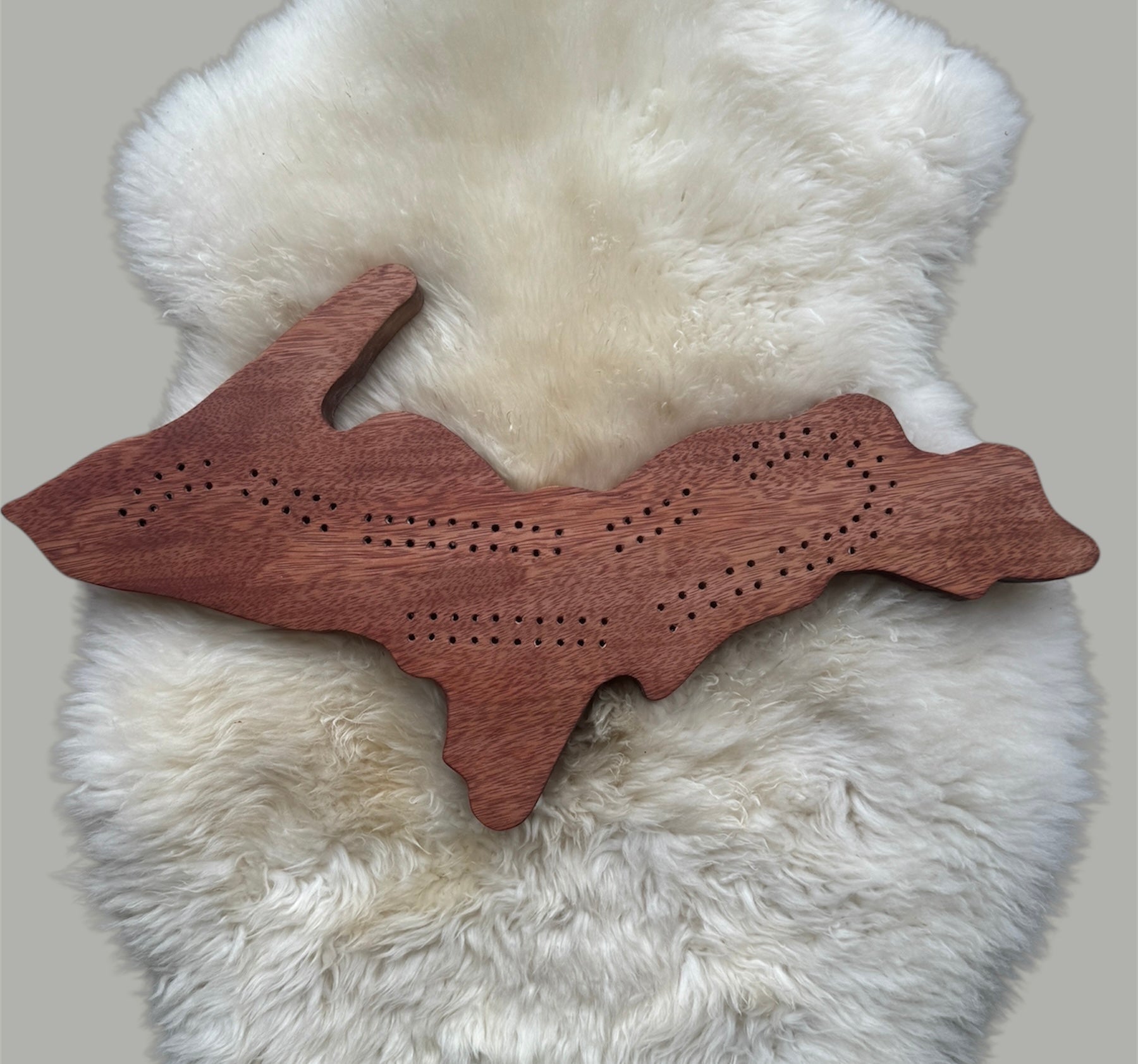 This delightful 2-person cribbage board, handcrafted by Grey Wolf Woodworks in Michigan, brings the spirit of the U.P. right to your game night. Shaped like the Upper Peninsula, it’s a charming way to keep score while showcasing your love for this unique region. Perfect for friendly battles and cozy competitions, this board combines quality craftsmanship with a playful twist that’s sure to spark smiles and good times. Comes with pegs, Pair this board with our Yooper Playing Cards!